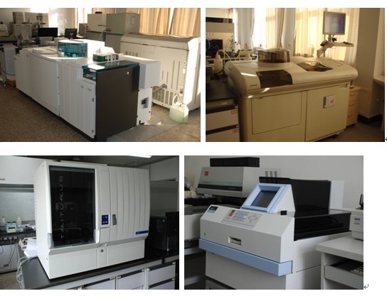 臨檢中心充分利用現有儀器設備及人才優勢服務于社會。技術上依托首都醫科大學雄厚的科研實力和高素質人才隊伍,并配有全自動生化分析儀(HITACHI 7180)、全自動酶免分析儀(DIAGNOSTIC GRI-FOLS、BIO-RAD)、全自動化學發光免疫分析儀(SIEMENS i2000;BECKMAN ACCESS 2 )、特種蛋白分析儀(BECKMAN IMMAGE 800)、放射免疫r計數器(PerkinElmer)、熒光顯微鏡(歐蒙)、血細胞分析儀(CIS CA-800;XS1000i )、熒光定量PCR儀(BIO-RAD)、流式細胞儀(BECKMAN FC-500)、蛋白電泳分析儀(HYDRASYS 2)、多元素分析儀、鎢舟元素分析儀(博暉)等高端檢測設備。